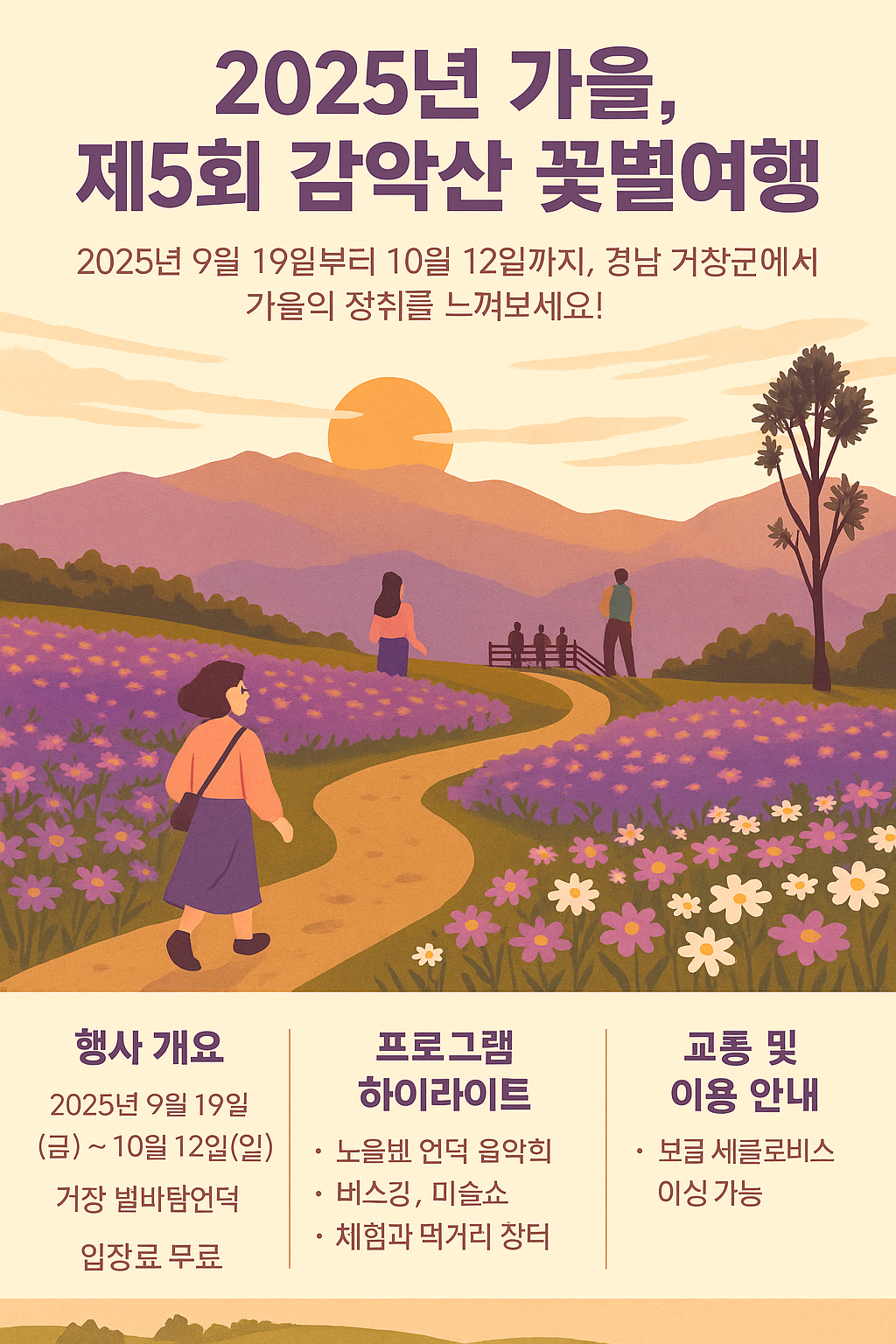 올해의 주제는 “보랏빛 노을 속으로”로, 감악산의 풍광과 가을꽃이 어우러진 감성적인 분위기를 선사합니다.