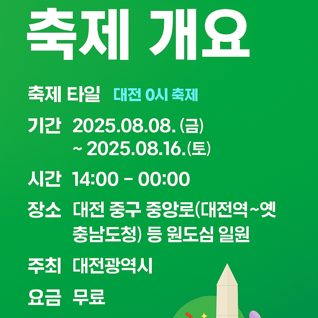 대전의 한여름 밤을 환하게 밝힐 2025 대전 0시 축제가 8월 8일부터 16일까지 9일간 진행됩니다.