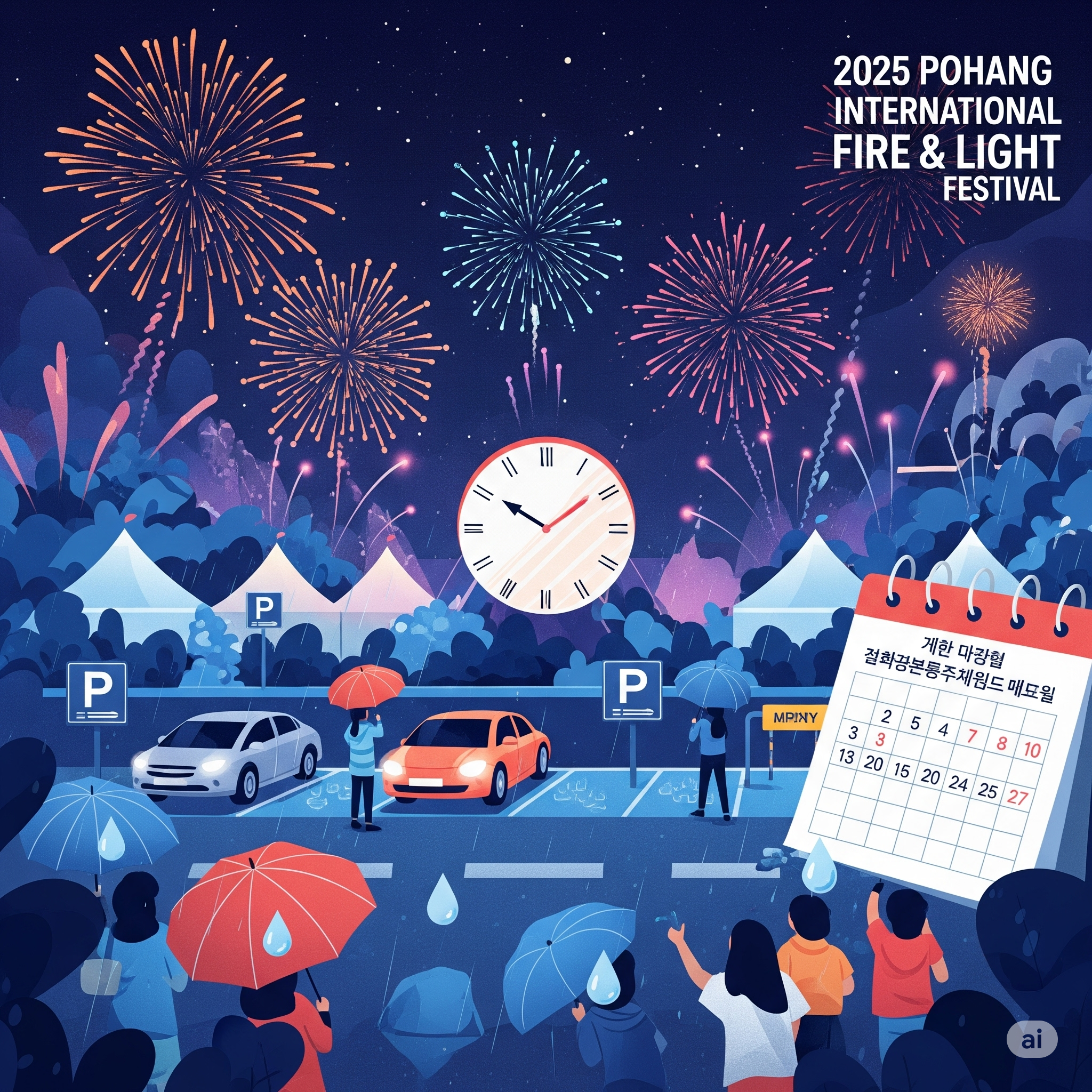 지금까지 2025 포항국제불빛축제의 성공적인 관람을 위한 우천 대비, 주차 정보, 기간 및 시간 정보를 상세히 안내해 드렸습니다.