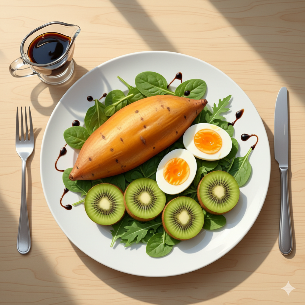 낮은 열량에도 불구하고 풍부한 영양소와 포만감을 제공하는 고구마, 장 건강을 책임지는 키위, 근육 유지와 식욕 억제에 탁월한 달걀, 그리고 혈당 조절에 도움을 주는 발사믹까지.