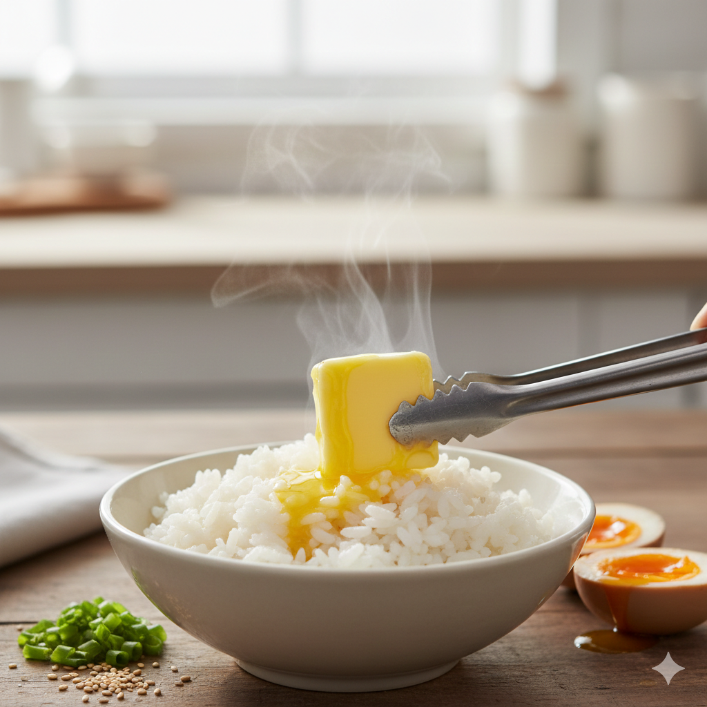 여기에 차가운 상태보다 갓 지은 뜨거운 밥을 사용하면 버터가 부드럽게 녹아들며 밥알 하나하나를 코팅해 최상의 식감을 선사합니다.