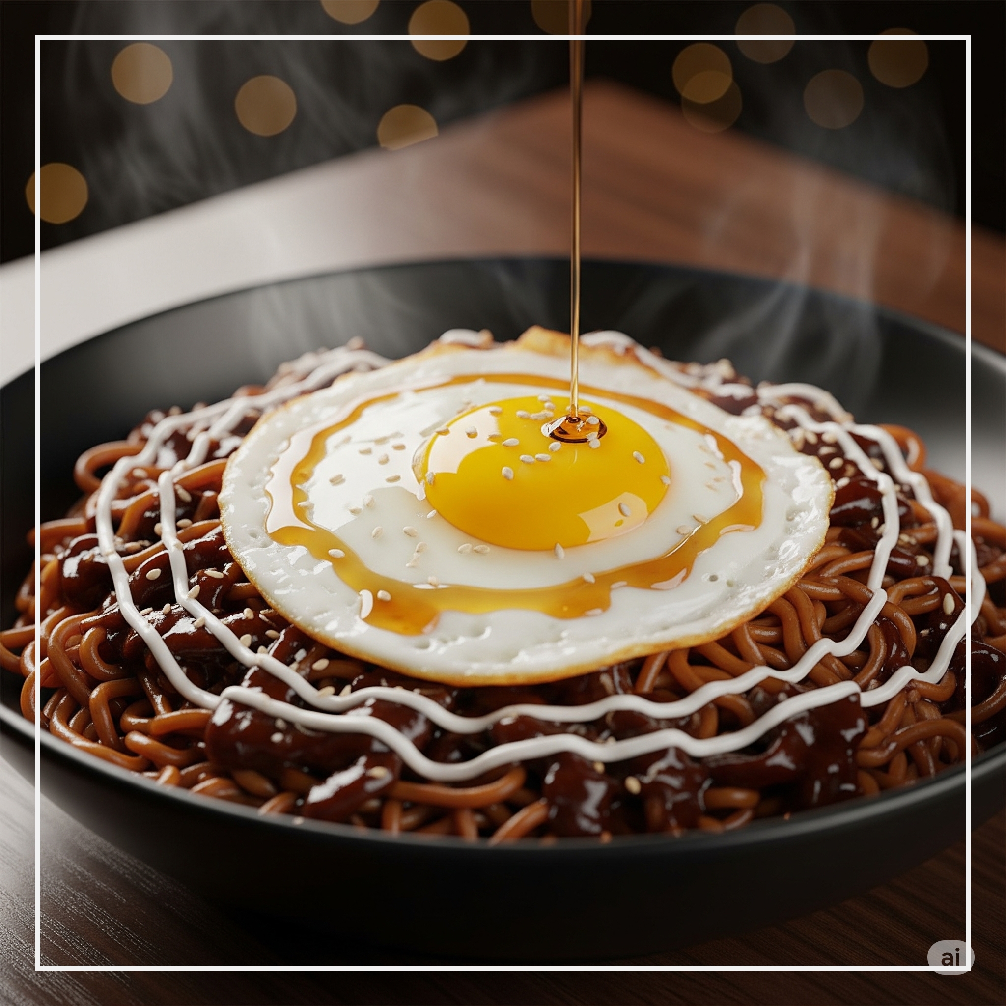 3. 완성된 짜파게티 그릇에 달걀을 정중앙에 올려줍니다.