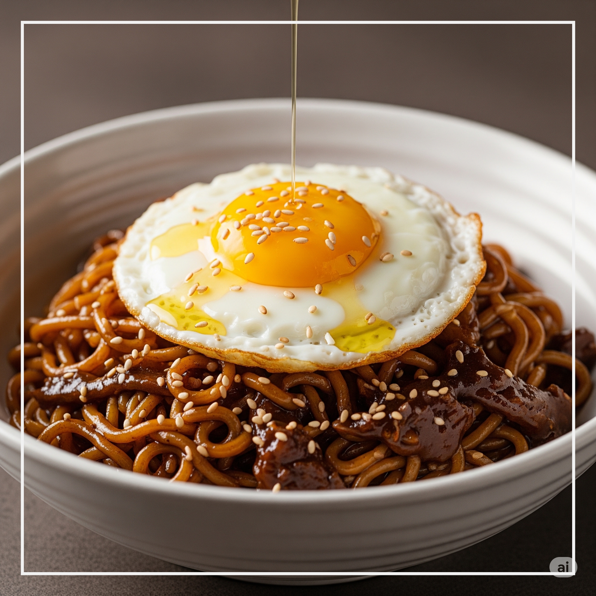 면 위에 달걀 프라이를 올린 뒤, 필요시 참기름을 한 바퀴 둘러 마무리합니다.