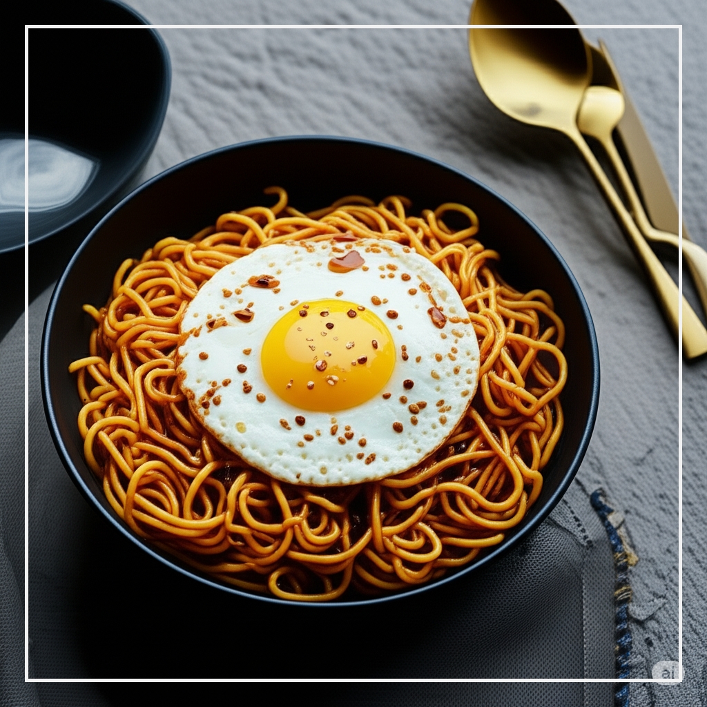 3. 완성된 짜파게티 그릇에 달걀을 정중앙에 올려줍니다.