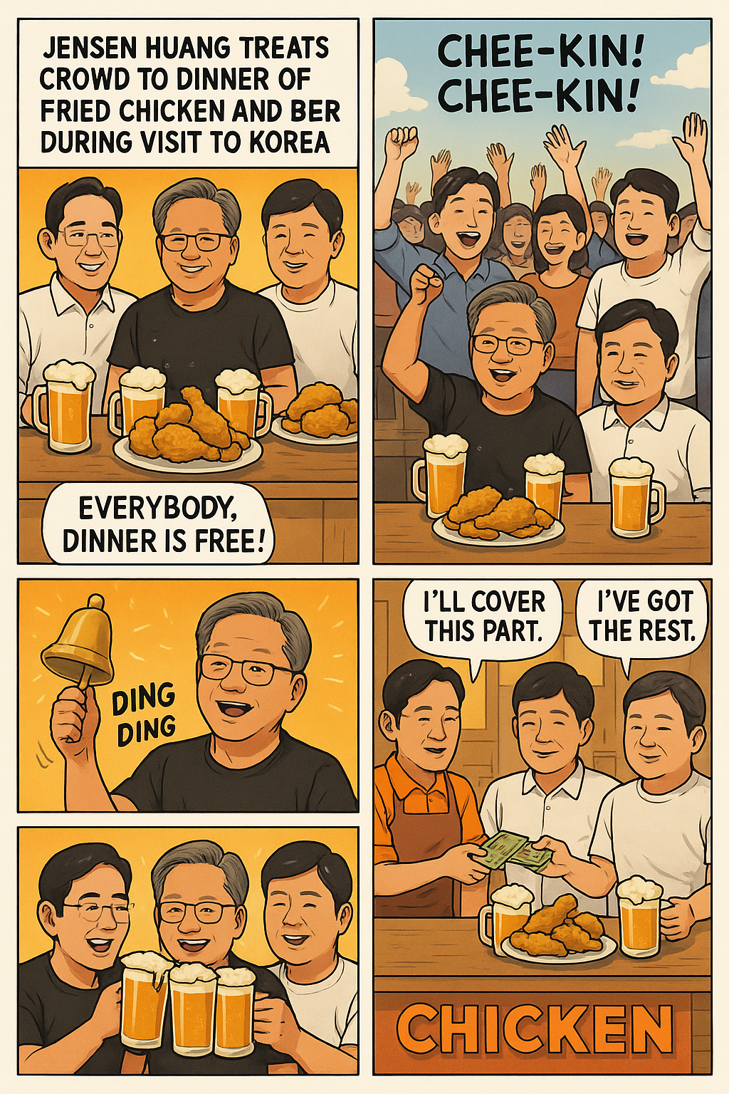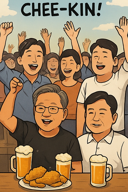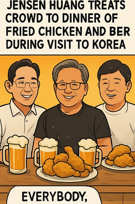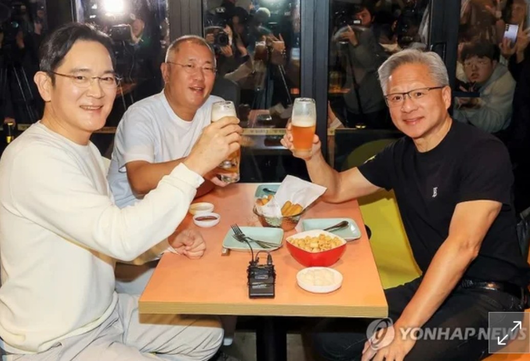10월 30일 밤, 서울 강남구 삼성동의 한 치킨집에서 세계 1위 AI 반도체 기업 NVIDIA의 창업자 겸 CEO Jensen Huang이 한국의 대표 기업인 Samsung Electronics과 Hyundai Motor Group의 수장들과 함께 ‘치맥 회동’을 가졌습니다.