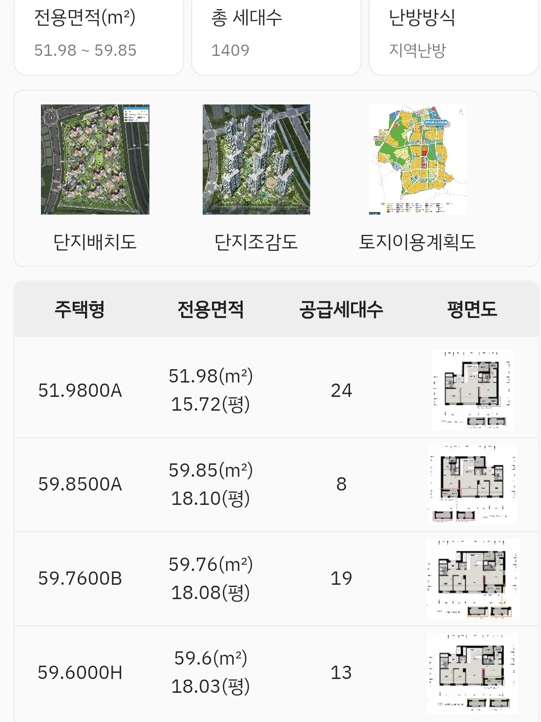 - 전용면적 : 추가모집 총 64세대 중 타입별 51A(24세대), 59A(8세대), 59B(19세대), 59B1(13세대)