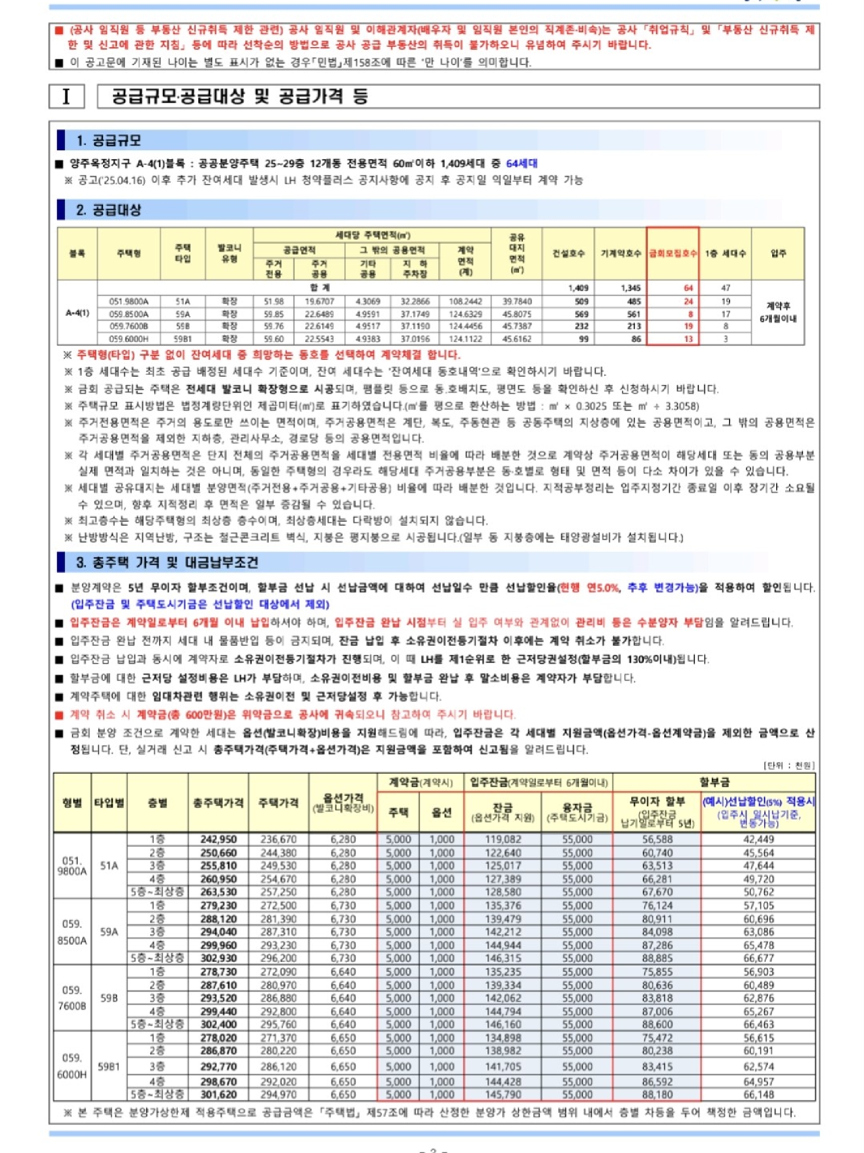 - 전용면적 : 추가모집 총 64세대 중 타입별 51A(24세대), 59A(8세대), 59B(19세대), 59B1(13세대)